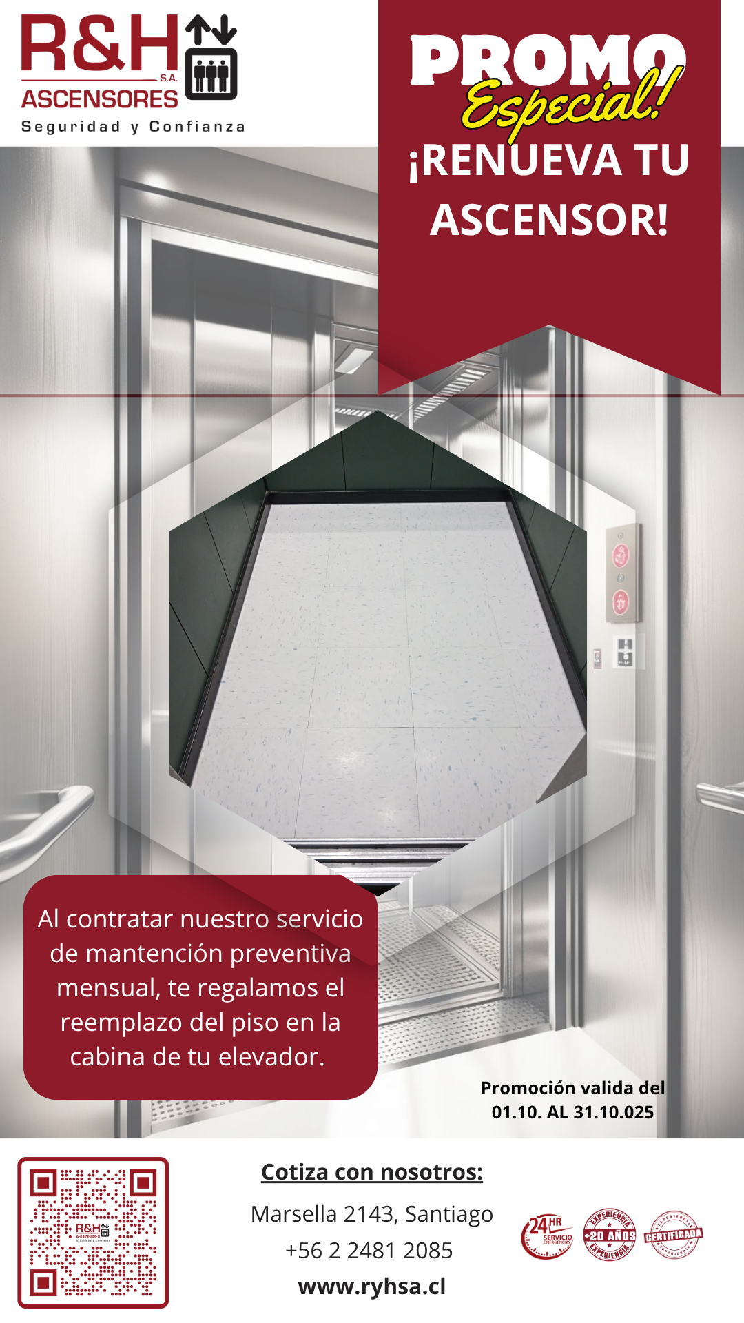 ¡Revisa nuestras ofertas exclusivas! SubtitleDescuentos especiales en mantenimiento, reparación y modernización de ascensores. ¡Aprovecha estas oportunidades únicas para optimizar tu sistema de transporte vertical! Consulta nuestras ofertas Dirección Comercial ▸ Marsella Nº 2143 Santiago. Región Metropolitana, Chile. Mesa Central (+56 2) 2481 2085 Emergencias 24 Horas (+56 2) 2316 8166 (+ 56 9) 6313 0682 Redes Sociales Whatsapp Instagram Facebook Youtube Linkedin